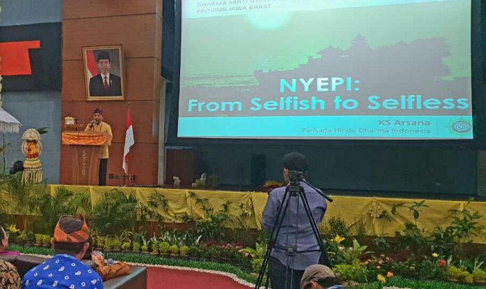 Bekasi – Parisada Hindu Dharma Indonesia (PHDI) Provinsi Jawa Barat melaksanakan kegiatan Dharmasanti hari raya Nyepi tahun baru Saka 1940 di Gedung Giri Hadi Suseno, Sekolah Tinggi Transportasi Darat (STTD), Jalan Raya Setu No 89 Desa Cibuntu, Kecamatan Cibitung, Bekasi, Minggu, 15 April 2018.