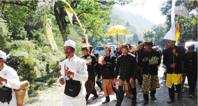 Probolinggo - Warga suku Tengger menggelar Prosesi Mendak Tirta. Ini dilakukan jelang Yadnya Kasada. Puluhan umat Hindu warga suku Tengger, menggelar ritual Mendak Tirta dengan berjalan kaki menuju mata air suci, air terjun Madakaripura, Desa Nogorejo Kecamatan Lumbang Kabupaten Probolinggo Jawa Timur, Senin (15/07/2019).
