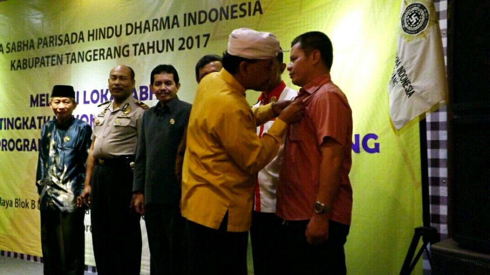 (Foto: pemberian lencana sebagai warga kehormatan umat Hindu Kabupaten Tangerang oleh Ketua Pengurus Harian PHDI Kabupaten Tangerang masa bhakti 2012-2017, Jero Mangku Astono Chandra Dana)