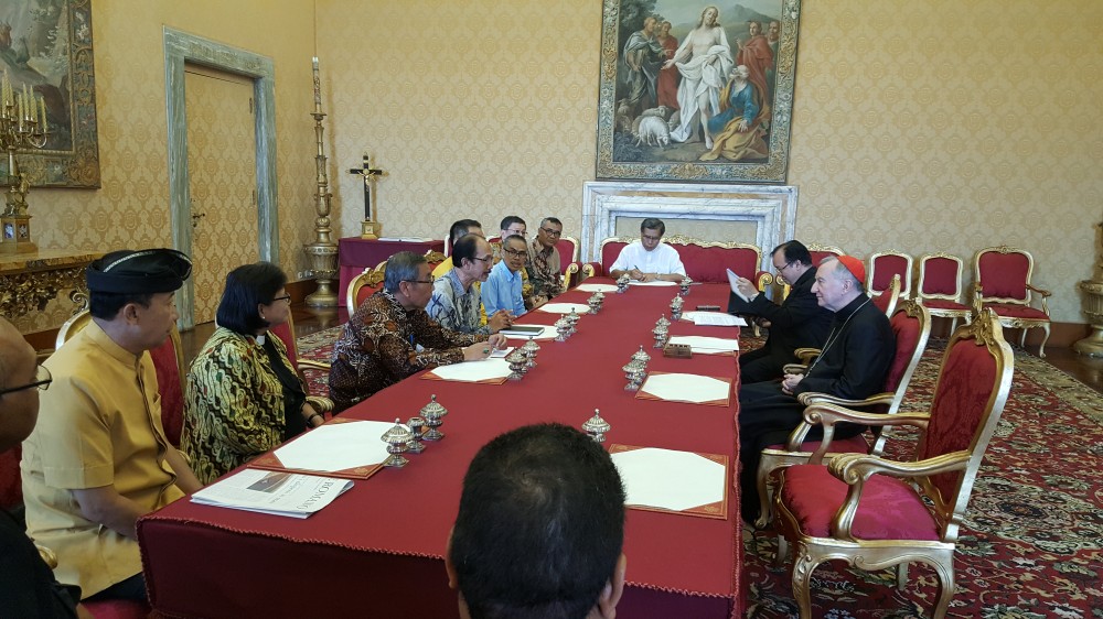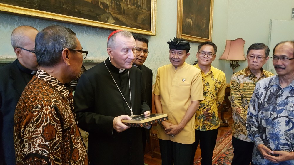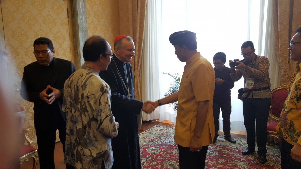 Pesan ini disampaikan Sekretaris Negara Vatikan Kardinal Pietro Parolin, orang kedua di Vatikan setelah Paus Fransiscus, saat menerima kunjungan perwakilan agama-agama di Indonesia bersama Sekjen Kementerian Agama Nur Syam, Dubes Indonesia untuk Taktha Suci Vatikan Agus Sriyono, dan Pastor Leo Mali Pr, serta Pastor Agustinus Punomo Msf dari Ikatan Rohaniawan-Rohaniwati di Kota Abadi-Italia, Rabu (4/7/2018), di Palazzo Apostolico, Vatikan, Roma. Kedatangan para delegasi Indonesia di gedung tempat kerja Paus ini didampingi anggota Dewan Kepausan untuk dialog Antar Agama Pastor Markus Solo SVD.