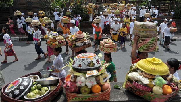 (Foto: kompas.com, Umat Hindu membawa sesajen saat persembahyangan hari raya Galungan di Ubud, Bali, Rabu (10/2/2016)