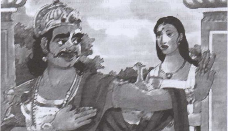 “Siapakah engkau, wahai wanita cantik. Wajahnya indah seperti bulan purnama, suaramu merdu seperti burung Kokla, dan matamu seindah bunga padma. Payudaramu bulat penuh begitu indah memerlukan untaian kembang dari emas, tiada celah bagi buluh di sela-selanya. Saat melihatmu berjalan birahi asmara bangkit di dadaku; pinggangmu sangat ramping, saat payudaramu bergerak membuat engkau merunduk. Payudaramu mirip dengan kuntum-kuntum bunga padma menyalakan nafsu birahiku. Pinggulmu bagaikan tepian sungai; demi dirimu aku rela menceraikan semua istri-istriku, menghiasimu dengan karangan bunga, jubah dan permata, mencintaimu seperti mendung penuh hujan yang menyirami bumi dengan curahan airnya.