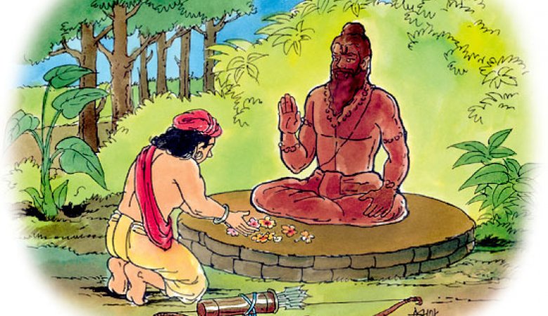 Arjuna dan Drona menemui si pemilik panah. Setelah setengah hari mencari, barulah mereka bertemu. Betapa terkejut Drona, ternyata yang dijumpainya hanyalah pemuda berkulit gelap dan begitu asing baginya. Ia lupa pernah bersua dengannya tempohari.