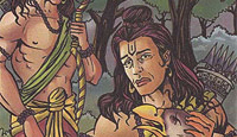 "Sri Rama memeluk Jatayu yang sayapnya terpotong dan seluruh tubuhnya berlumuran darah, ditanyakan tentang keberadaan belahan jiwanya Sri Rama, Dewi Sita, yang sudah pergi (dilarikan Rahvana), lalu Jatayu terjatuh ke atas tanah."