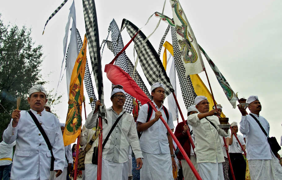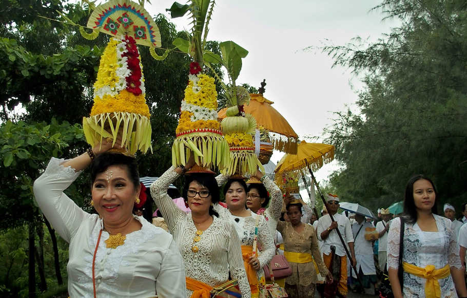 (Foto: Umat Hindu berjalan menuju tempat berlangsungnya ritual Melasti untuk menyambut Hari Raya Nyepi, di kawasan Pantai Marina Semarang, Jawa Tengah, 11 Maret 2018)