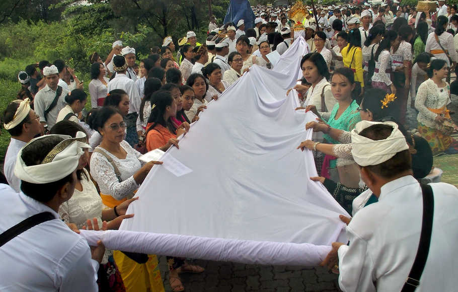 (Foto: Umat Hindu menggulung kain putih dalam ritual Melasti untuk menyambut Hari Raya Nyepi, di kawasan Pantai Marina Semarang, Jawa Tengah, 11 Maret 2018)