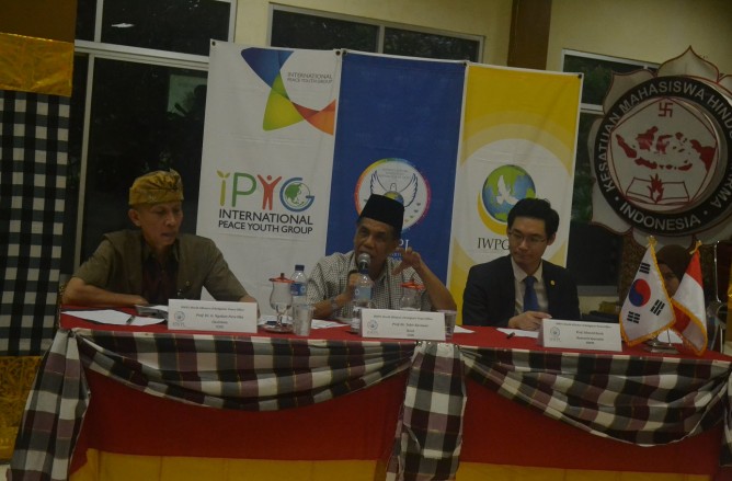 Makassar – Ketua Dewan Senat Akademik Universitas Hasanuddin Makassar, Prof Dr HM Tahir Kasnawi SU, menjadi salah satu pemateri dalam dialog antar umat beragama untuk perdamaian dunia, di Aula Pura Giri Natha Tamalanrea, Rabu (27/4).