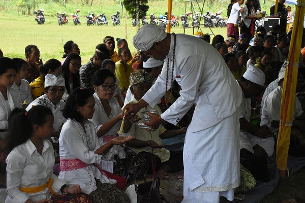 (Foto: Pemangku memercikkan air suci/tirtha kepada umat Hindu pada saat upacara melasti di Telaga Madirda, Ngargoyoso)