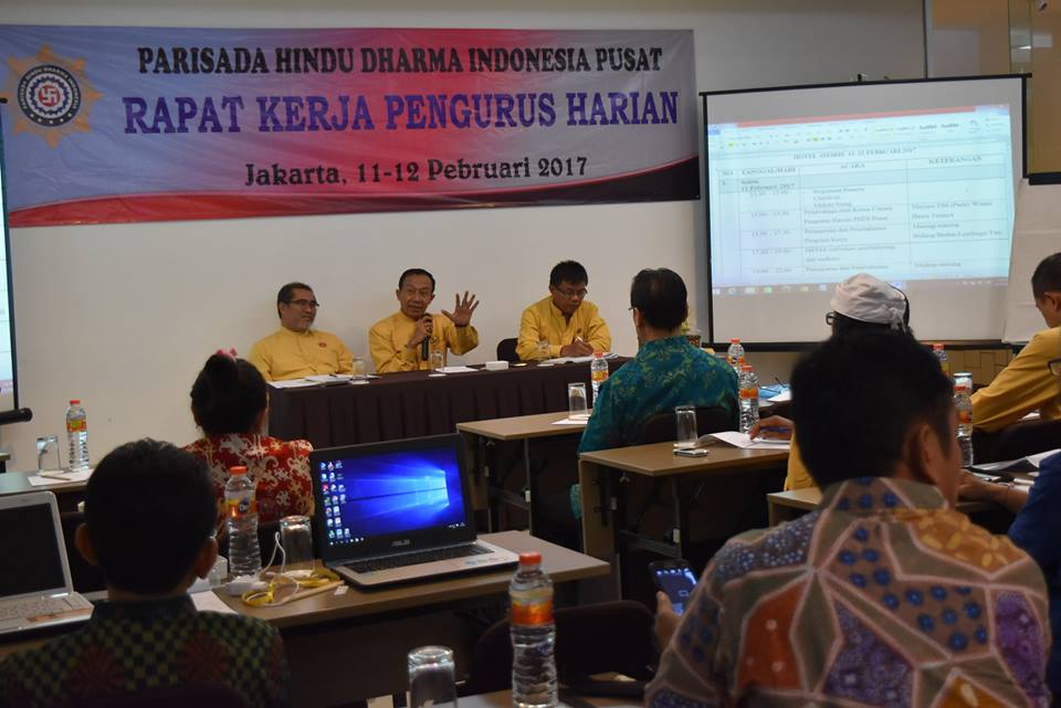 Jakarta - Pengurus Harian Parisada Hindu Dharma Indonesia (PHDI) Pusat menggelar Rapat Kerja (Raker) Tahun 2017 dengan melibatkan juga Yayasan, Badan, Lembaga, dan Tim yang berada di bawah Pengurus Harian PHDI Pusat. Rapat Kerja dilaksanakan selama dua hari, Sabtu dan Minggu, 11-12 Februari 2017, di Hotel Amaris, Pancoran, Jakarta. Sesuai amanat konstitusi organisasi, Rapat Kerja dilaksanakan untuk menyusun Program Kerja sebagai turunan Program Umum yang ditetapkan Mahasabha XI di Surabaya.