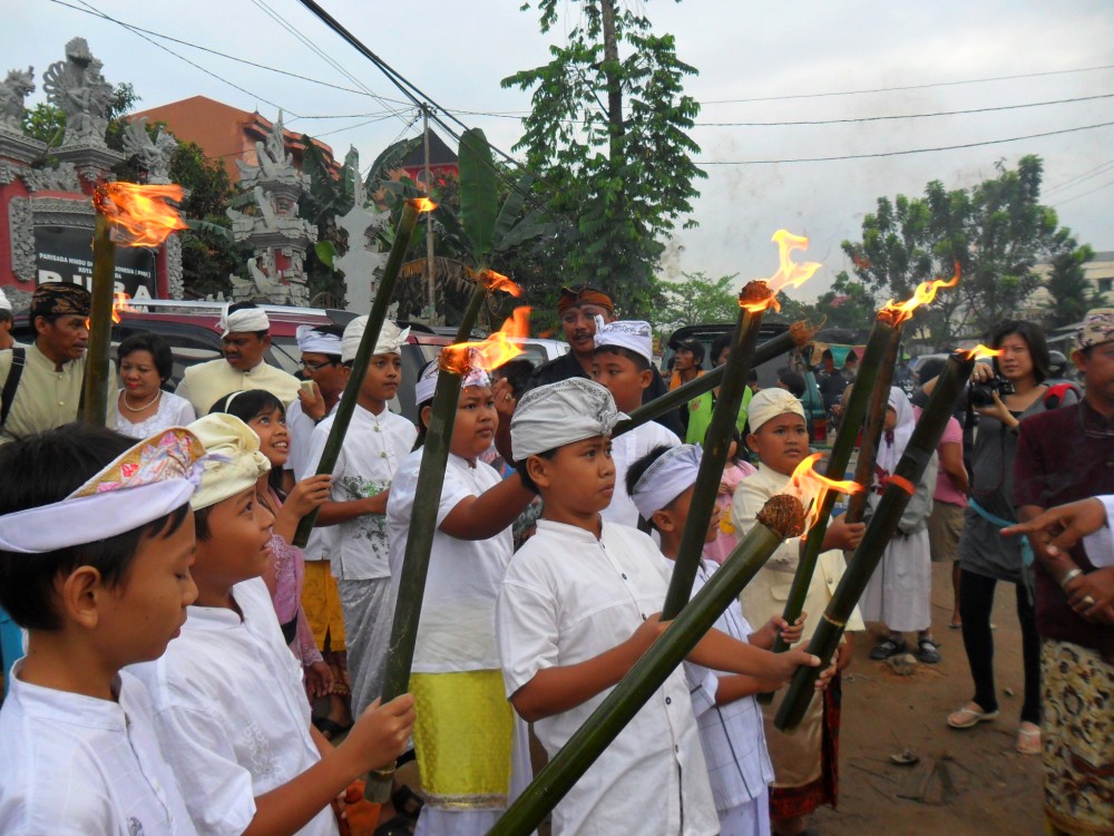 (Foto: Umat Hindu membawa obor pada saat upacara Tawur Kesanga Perayaan Nyepi Tahun Baru Saka 1940)